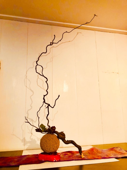 I picked a piece of vine branch next to the oven, I appreciate its line very much and it presents the beautiful delicate long line in this arrangement, as first main stem (Shin) and the rose as focus flower, the green ball as another main stem (Hikae), in this simplified free style arrangement, the 2nd main stem ( Soe) is omitted.